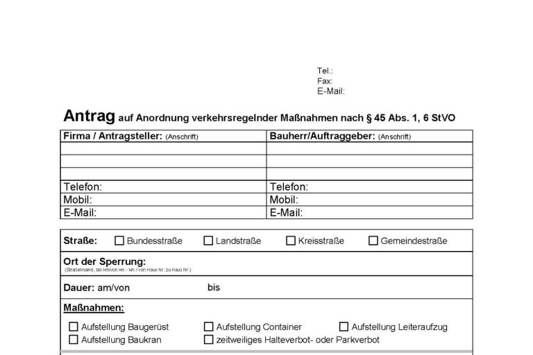 Aufstellort ( PLZ, Ort, Straße, Hausnummer), Gültigkeitszeitraum (Datum und Uhrzeit), Länge der Halteverbotszone, Art der Maßnahme (z.B. Umzug), evtl. Breite der Halteverbotszone. Sollte die Uhrzeit oder die Länge fehlen, wird allgemein als Standartwert anerkannt: Uhrzeit von 7:00 bis 19:00 Uhr, Länge 15m.