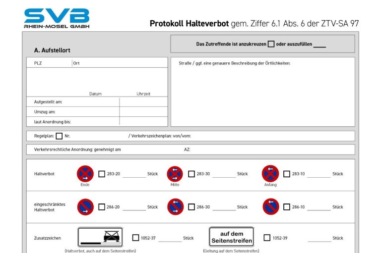 SVB haftet nicht für Schäden und Folgeschäden die durch Diebstahl oder Veränderung einer Halteverbotszone verursacht werden, bzw. worden sind. Sollte eine Halteverbotszone am Bestimmungsort gestohlen worden sein, so muss SVB umgehend informiert werden, Sollte die Zeitspanne zum Gültigkeitsdatum ausreichend sein, wir SVB versuchen, eine neue HVZ aufzustellen, dieses kann jedoch nicht garantiert werden.